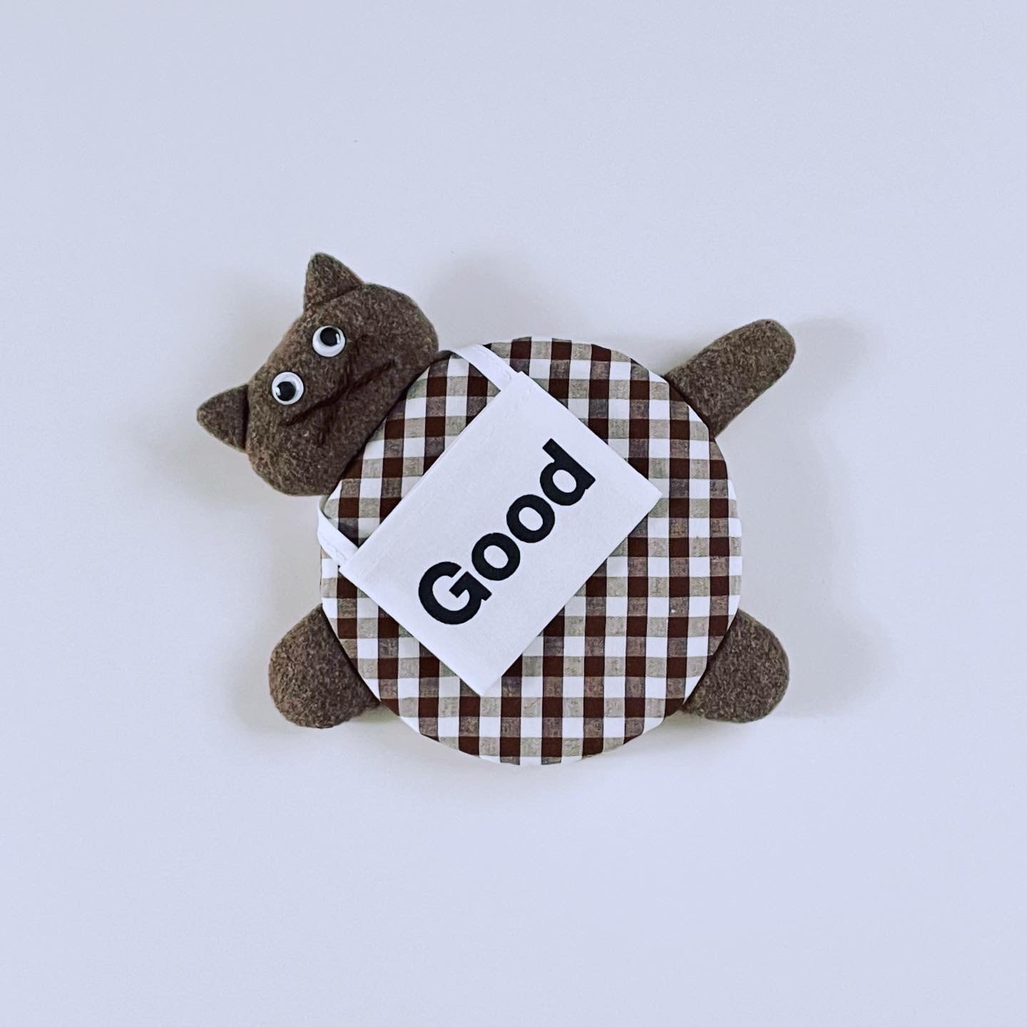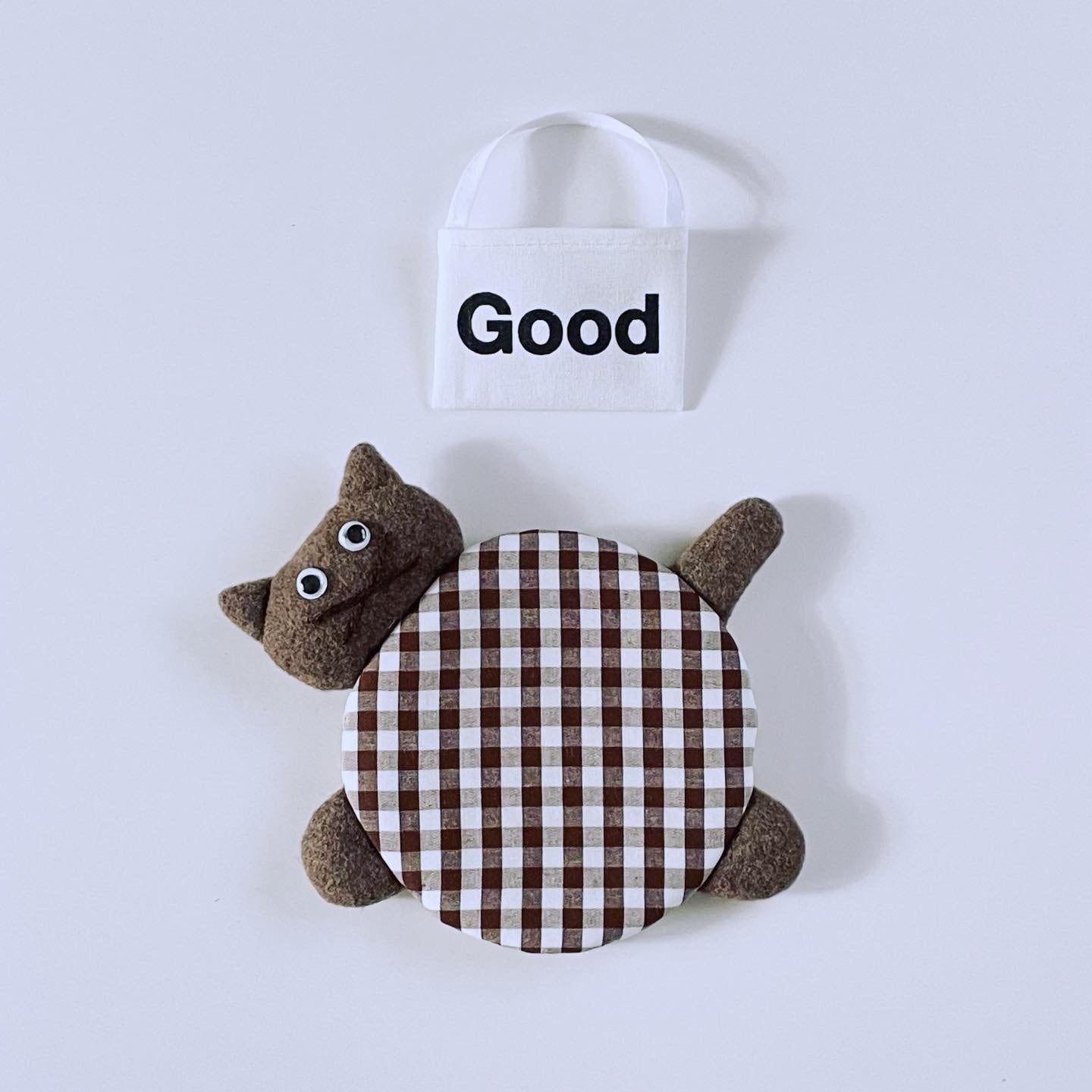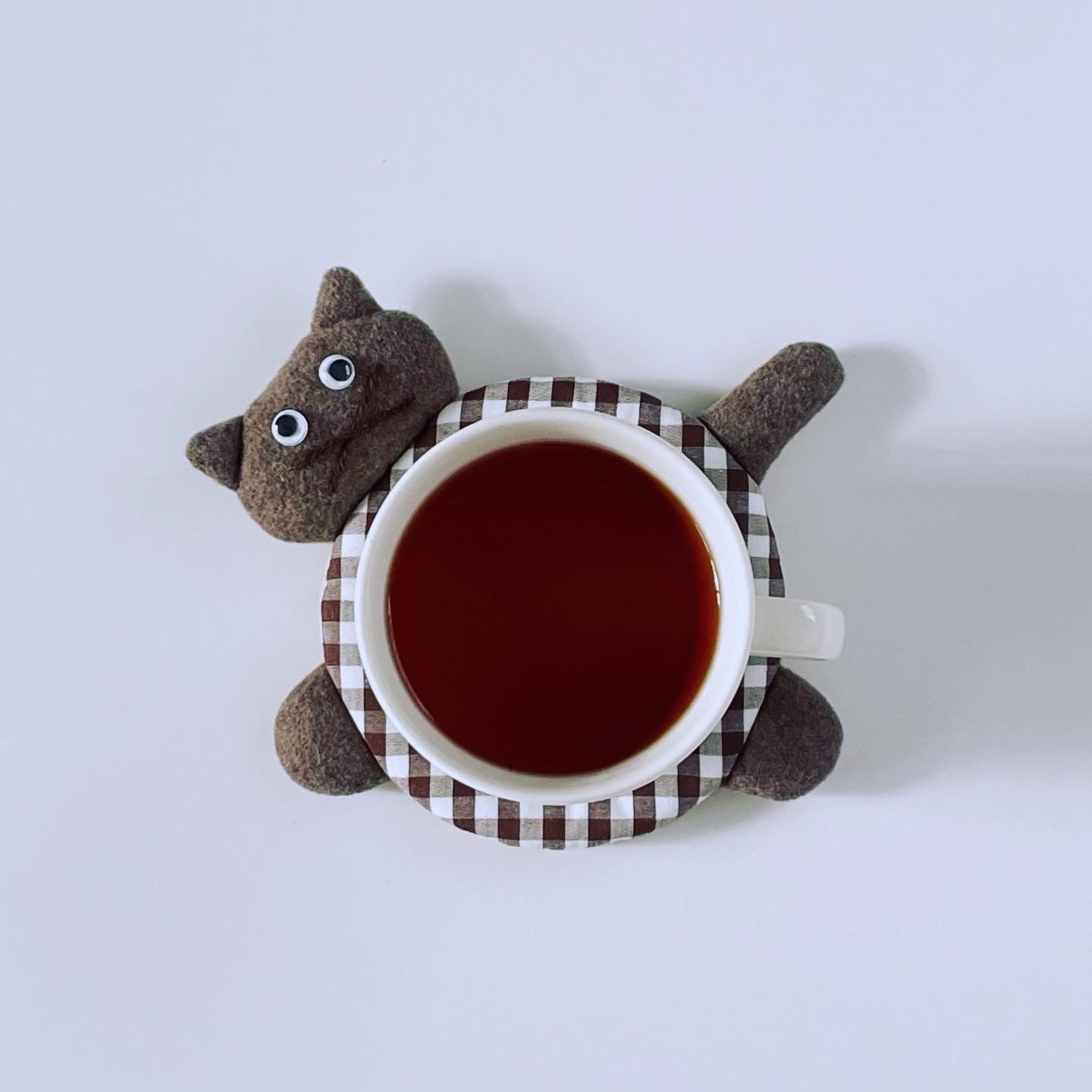 猫の顔や手足尻尾は焦茶色で、丸い部分は焦茶色のギンガムチェックです。
