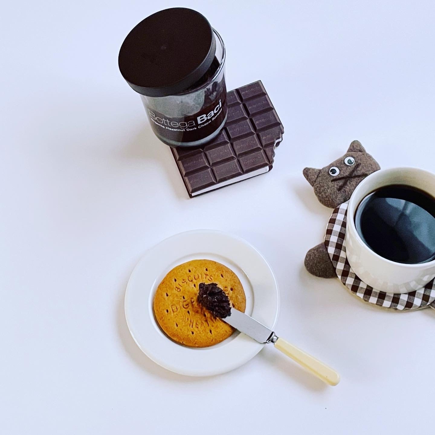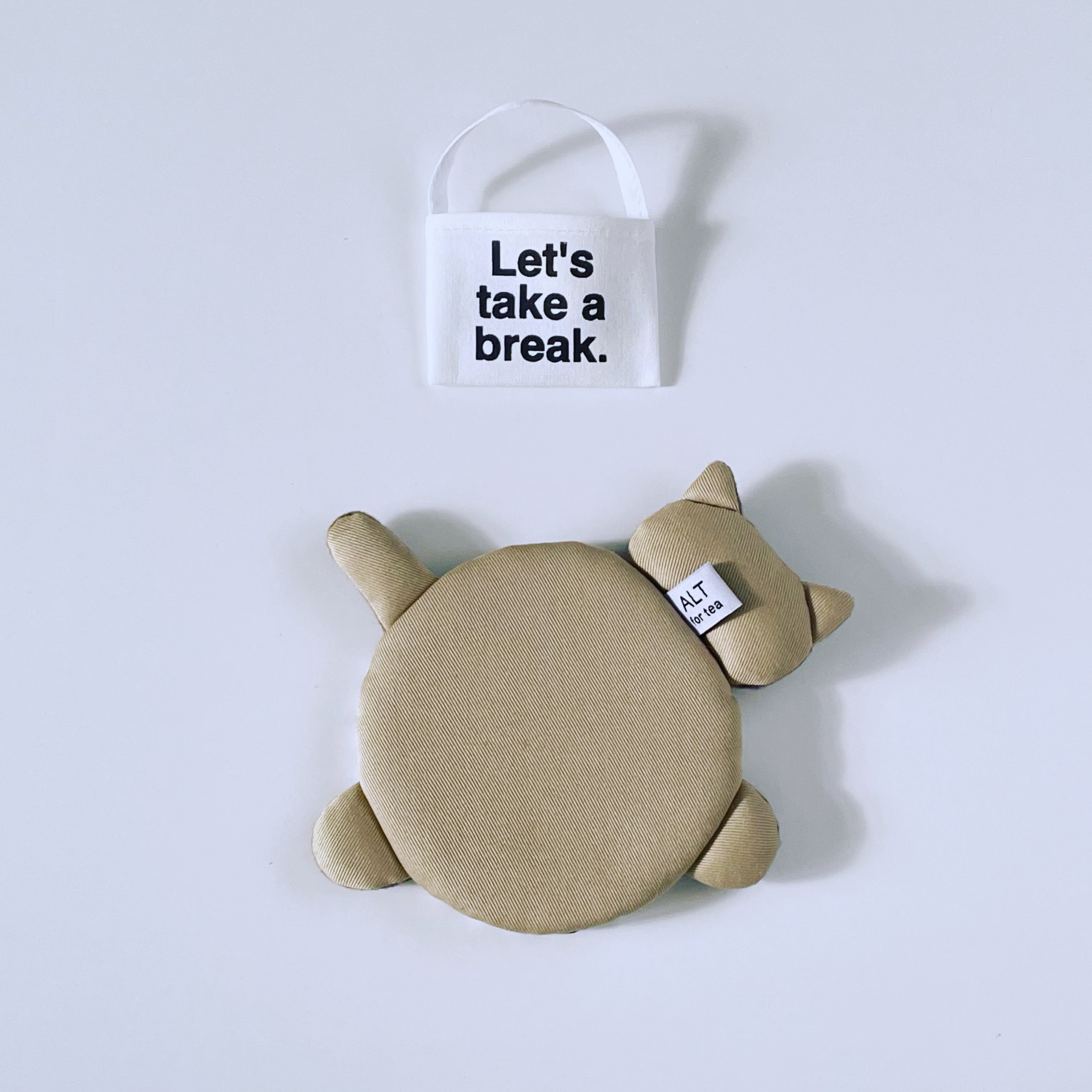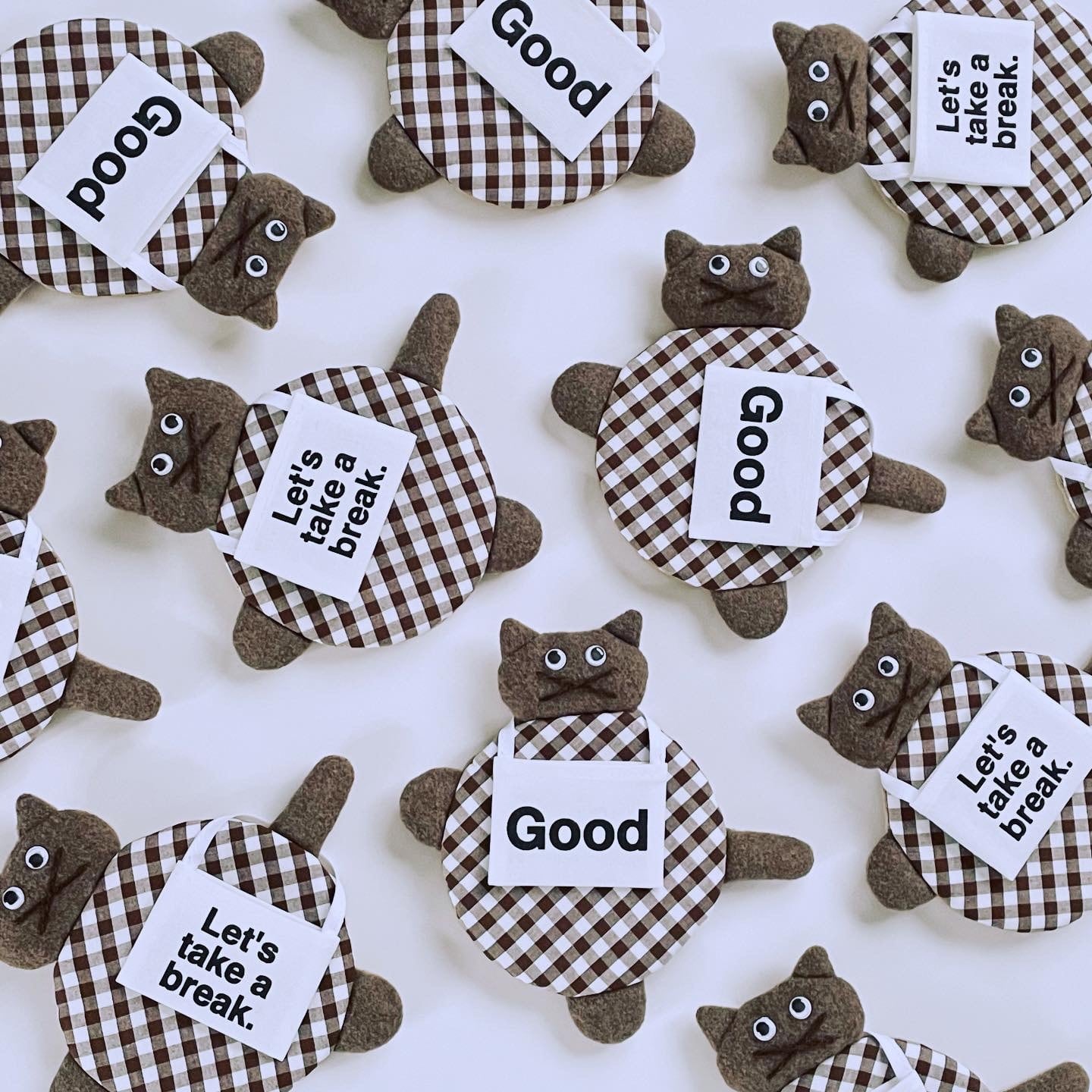 「Let’s take a break.」/「Good」と表裏にプリントした小さなバッグを引っ掛けています。